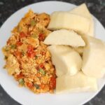 Tender boiled yam slices served with a colorful, garden-fresh tomato and onion egg sauce.